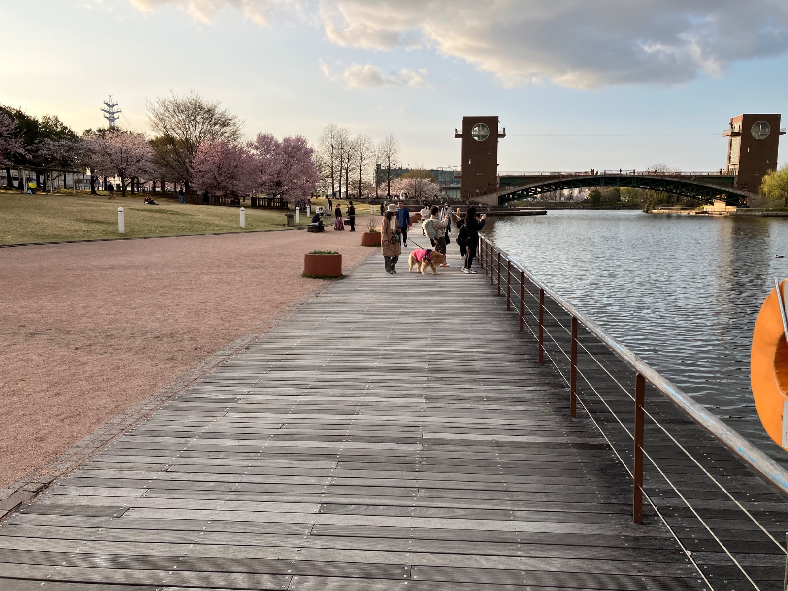2枚目は公園内の木製デッキからの眺め。人気の撮影スポットで、多くの花見客が記念写真を撮っていました。時計台が見える橋が背景に映り込んでいるのが、この公園らしい風景です。