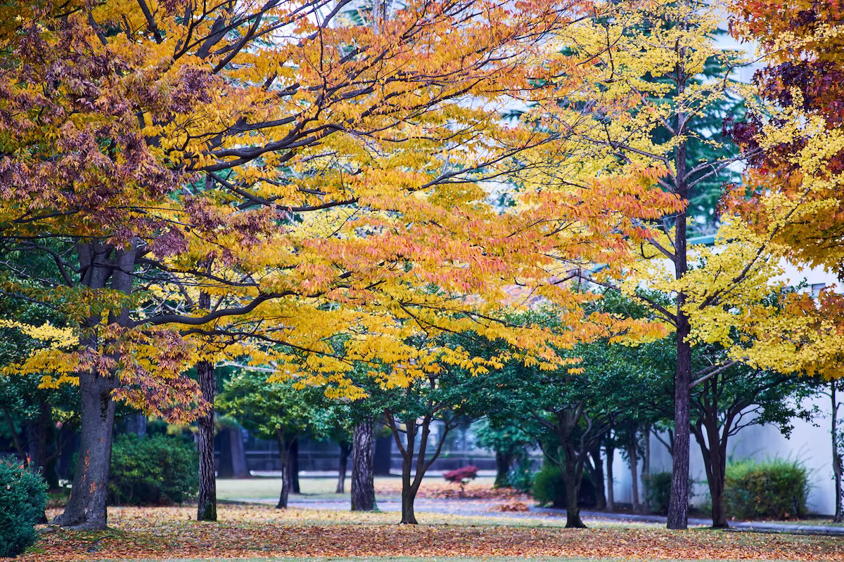 五福公園の秋は、紅葉と銀杏が同時に色づく貴重な季節。赤・黄・緑が層のように重なり、奥行きのある美しい並木道が続きます。午前の光に照らされ、葉の色彩が一段と際立ちます。