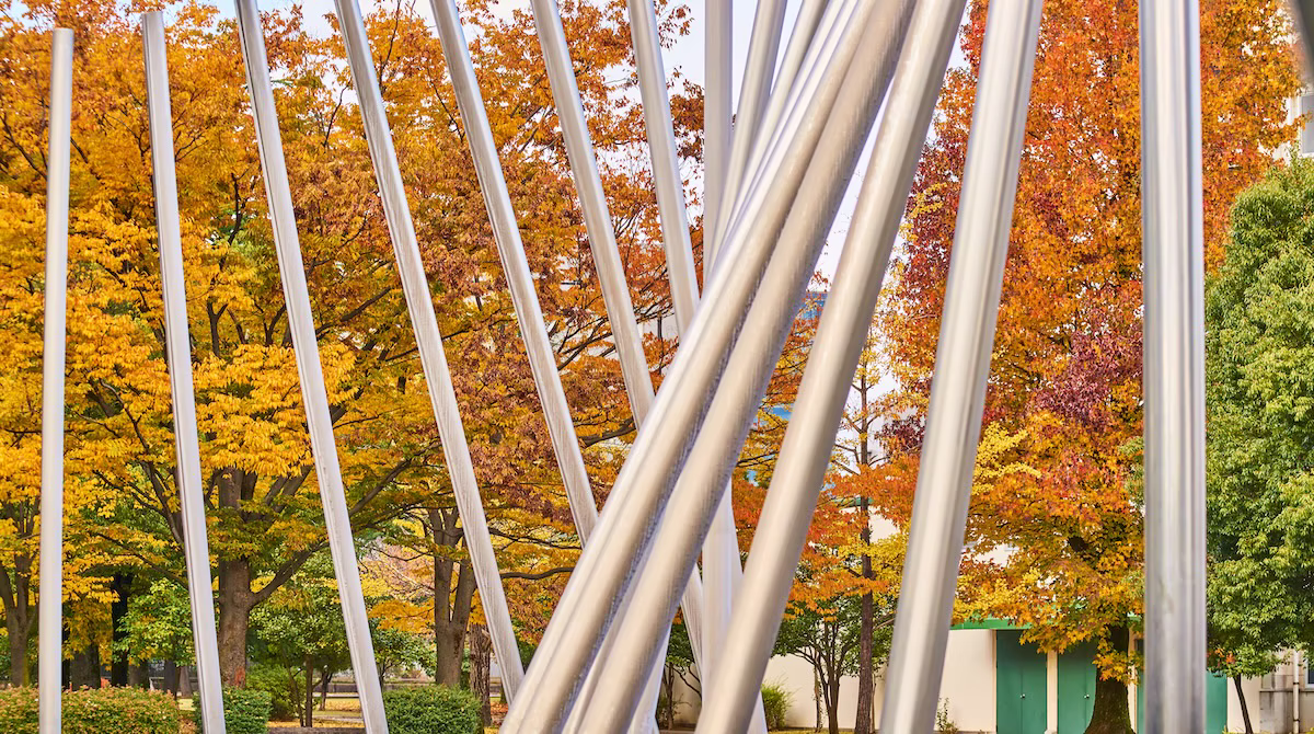 五福公園に点在するアートオブジェは、公園の景色にアクセントを与えてくれる存在です。この写真では、オブジェの直線的な光沢と、背後の紅葉の柔らかな色彩を対比させることで、自然と人工物の調和を表現しています。晩秋ならではの深い色合いが印象的。