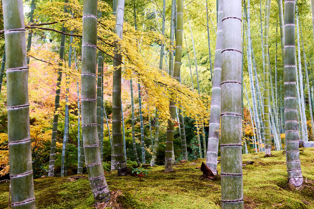 常寂光院の境内では、竹林と苔むす地面、そして色づいたモミジが互いに調和し、秋だけの静けさと温かさを生み出します。