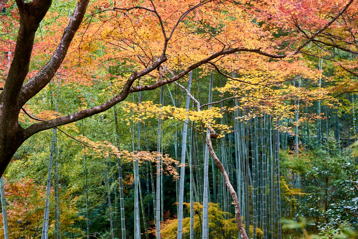 枝ぶりの力強いモミジが画面を横断し、その下から青竹が林立する様子が姿を現すことで、立体的で奥行きを感じる構図になっています。紅葉・竹・常緑樹の色層が重なり、常寂光院の多彩な秋の表情を広い視野で捉えました。