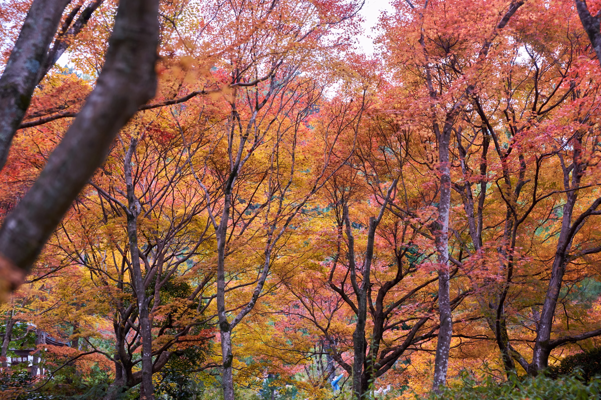 本堂裏庭の紅葉は、見上げるほど背の高いモミジが密に並び、まるで色彩の天蓋の下を歩いているような感覚を生み出します。黄から橙、そして赤へと移り変わる豊かなグラデーションが秋の深まりを象徴し、訪れる人々を静かな感動へと導きます。木々の広がりが奥行きを感じさせ、常寂光院の自然美を象徴する一枚です。