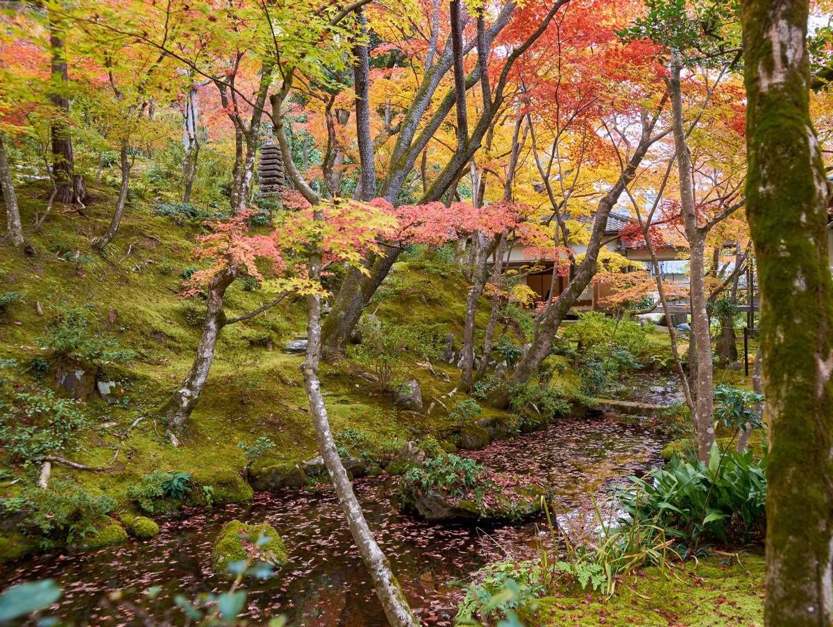 本堂裏庭には苔むした美しい斜面と小さな流れがあり、紅葉の季節にはその全体が柔らかな色彩に包まれます。水面には散り紅葉が広がり、揺れる葉影が庭全体の静けさを引き立てていました。苔の緑と紅葉の暖色が融合し、常寂光院らしい穏やかな秋景が広がる一枚です。