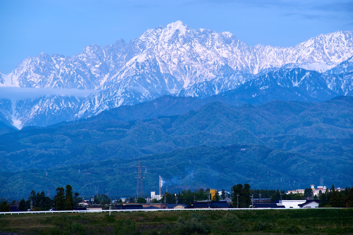 剱岳は、冬になると真っ白な雪をまとい、麓の集落や森林と対照的な姿を見せます。人々の暮らしのすぐ背後にそびえる険しい岩峰は、自然と生活が密接に結びついていることを感じさせる光景です。