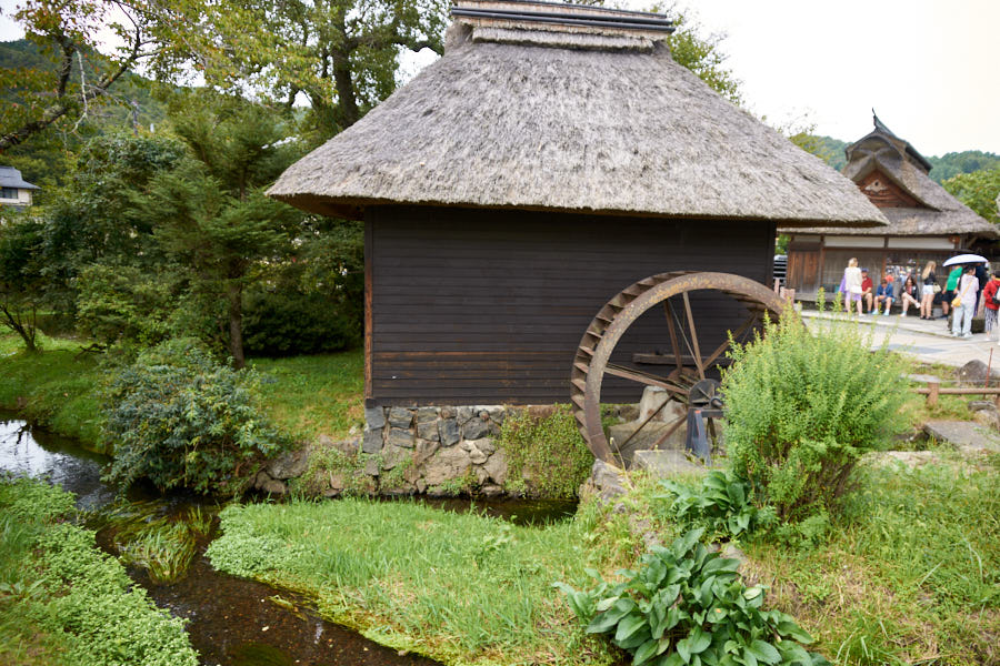 水車小屋と茅葺き屋根の風景